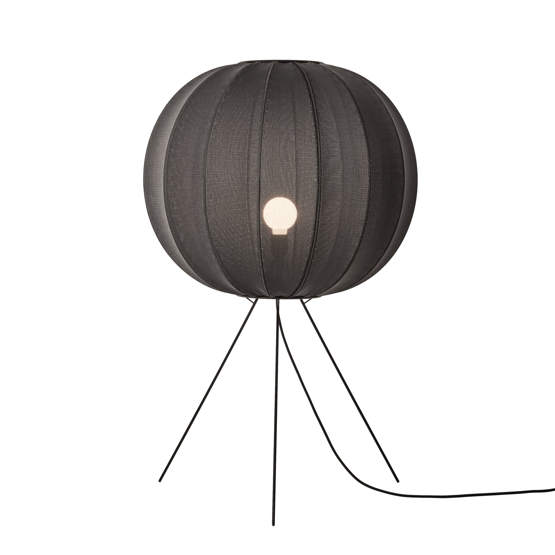 Floor lamp with foot switch on cord providing diffused ambient light. Bulb is visible through shade and one can use either a frosted or clear bulb to change the look. Production Process: The shade is knitted in three dimensions to give the ultimate in visual texture and interest. This process produces no waste material.