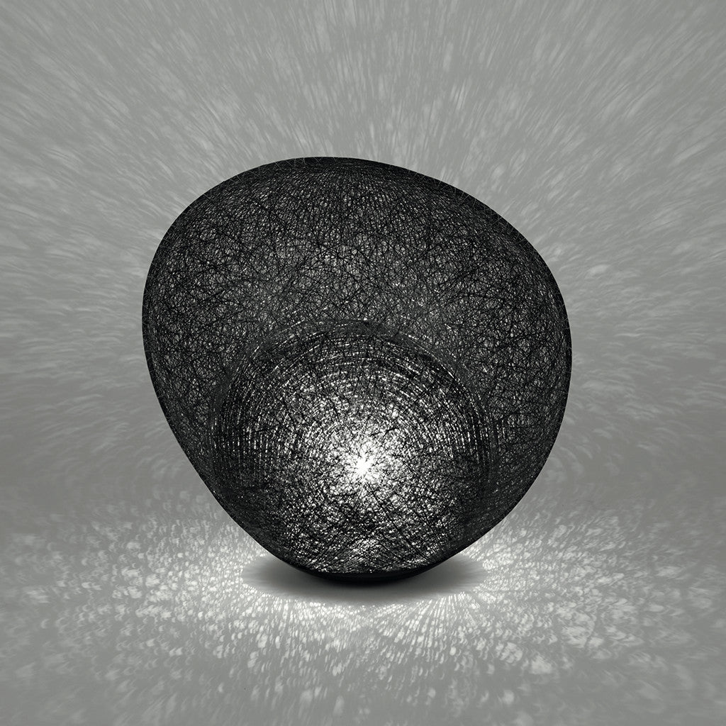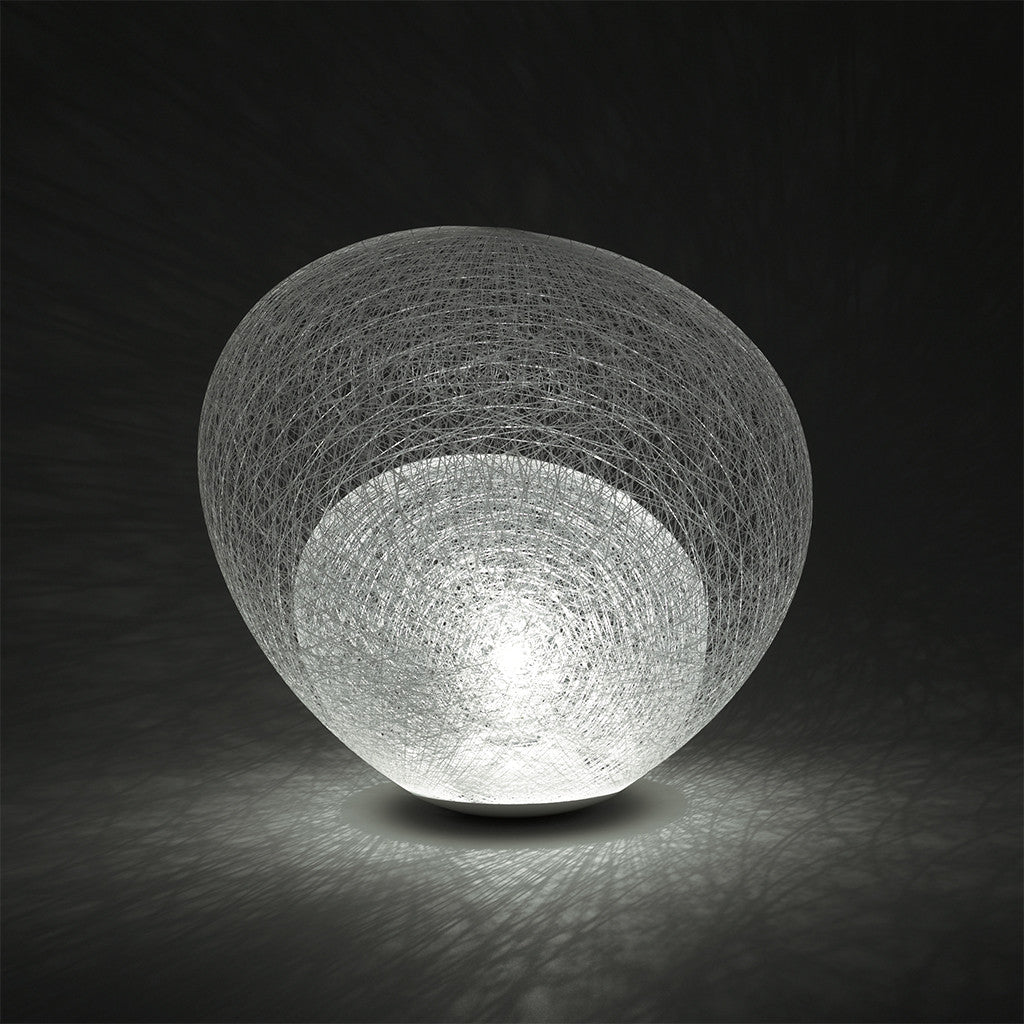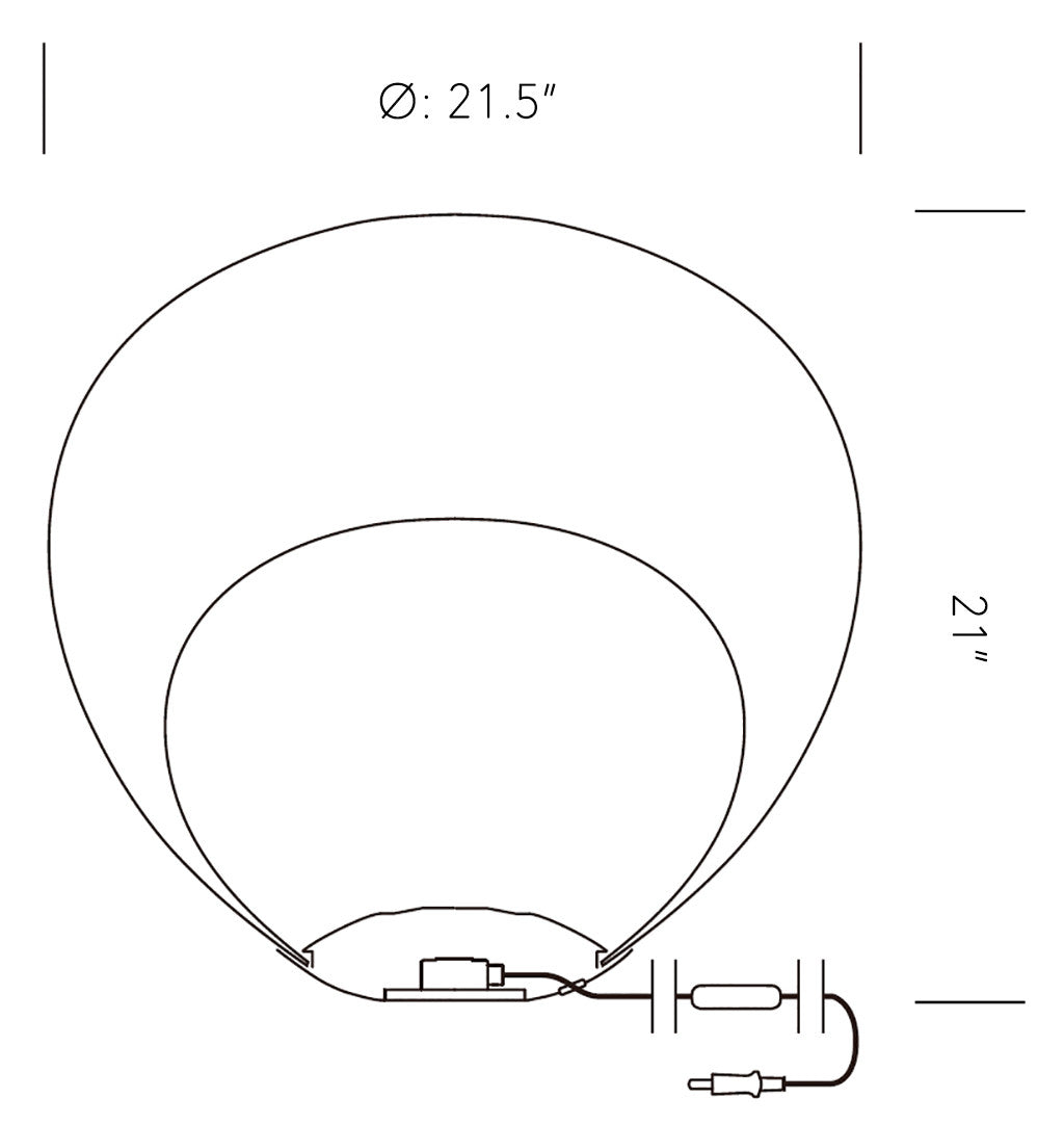 The floor lamp is constructed from spindles of Fiberglass and Aluminum, forming a shade with a silk-like facade. Fixture uses incandescent bulbs (not included) to play with the spindles to cast a soft, ambient light to the immediate area, making it best suited for application in living rooms, bedrooms, and office areas. Asymetrical floor or table lamp comprised of two nested spun fiberglass shades and steel frame. Production Process: The shade is made from by spinning the frame while a fiberglass stream is laid continuously.